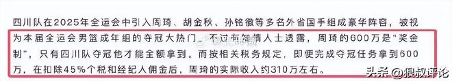 据新民晚报记者李元春报道,周琦与四川男篮的六百万是“奖金制”,只有四川队夺冠他才能全额拿到。而且按相关税务规定,即便完成夺冠任务拿到600万,在扣除45%个税和经纪人佣金后,周琦的实际收入约310万左右。