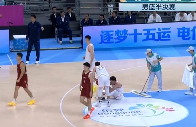 第三节王奕博挤过防守时倒地,膝盖撞了一下。